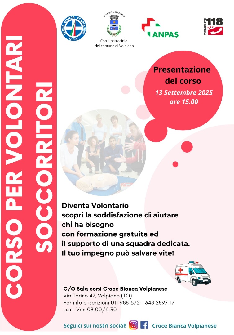 Croce Bianca Volpianese, il corso per aspiranti volontari soccorritori News 4 Settembre 20258 Settembre 2025 La Croce Bianca Volpianese ODV, realtà storica impegnata nell’assistenza sanitaria e nel soccorso alla popolazione, annuncia l’avvio di un nuovo corso di formazione rivolto agli aspiranti volontari soccorritori del 112. L’iniziativa offre a chi desidera mettersi in gioco la possibilità di acquisire competenze tecniche e capacità operative indispensabili per affrontare le emergenze sanitarie e collaborare con gli operatori professionali. Il percorso formativo sarà presentato sabato 13 settembre alle ore 15.00 presso la Sala Corsi di via Torino 47 a Volpiano. Durante l’incontro gli istruttori illustreranno nel dettaglio il programma, che prevede lezioni teoriche e pratiche, tempistiche e modalità di svolgimento delle attività. I partecipanti potranno confrontarsi direttamente con i formatori per comprendere gli incarichi e le responsabilità che attendono i futuri volontari. Cosa prevede il corso per soccorritori Il corso mira a formare cittadini capaci di intervenire con prontezza in situazioni critiche. Tra le competenze previste rientrano la gestione delle chiamate di emergenza e la comunicazione con la Centrale Operativa 118, il primo soccorso in caso di incidenti o malori, l’uso del defibrillatore semi-automatico (DAE), la stabilizzazione del paziente e il trasporto in sicurezza verso le strutture ospedaliere. Particolare attenzione sarà dedicata al lavoro di squadra con altri operatori del soccorso, alla collaborazione con forze dell’ordine e vigili del fuoco e alle attività di prevenzione e assistenza durante eventi pubblici. La formazione non si esaurirà con il termine del corso: i volontari saranno infatti coinvolti in sessioni di aggiornamento periodiche per mantenere alto il livello di preparazione. Un impegno per la comunità L’iniziativa, realizzata con il patrocinio del Comune di Volpiano, rappresenta una concreta occasione di impegno civile e di crescita personale. Diventare volontari soccorritori significa non solo acquisire competenze, ma anche entrare in una rete solidale che opera quotidianamente per la salute e la sicurezza collettiva. Per informazioni e iscrizioni è possibile contattare la Croce Bianca Volpianese ODV ai numeri 011.9881572 o 348.2897117, dal lunedì al venerdì, dalle ore 8.00 alle 16.30. LEGGI ANCHE: Nuova Acropoli Torino presenta il nuovo percorso di filosofia attiva Share on Facebook Share Share on TwitterTweet Send email Mail Print Print