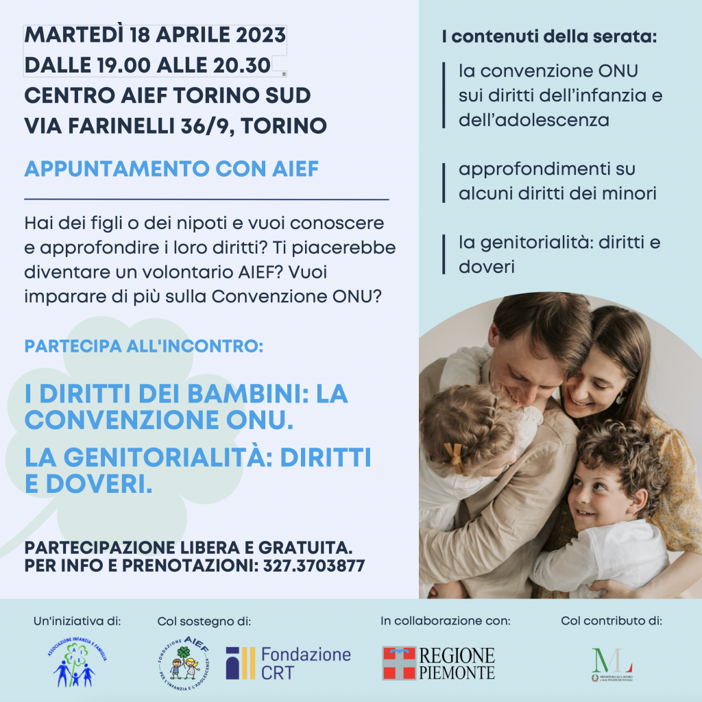 « Tutti gli Eventi Questo evento è passato. AIEF, “Diritti dei bambini e dei genitori” 18 Aprile 2023 h 19:00 - 20:30 « Torino Chamber Music Festival 2022 – 2023: concerti della IX Edizione Torino Chamber Music Festival 2022 – 2023: concerti della IX Edizione » Le basi per la nascita dell’Associazione AIEF si fondano sull’aiuto del presidente Tommaso Varaldo ad un giovane del territorio Torinese i cui diritti erano seriamente violati. Dalla volontà di perpetuare il supporto ed il sostegno anche a tutte le famiglie in difficoltà, espandendo il più possibile il raggio d’azione, nasce nel 2018 l’Associazione Infanzia e Famiglia AIEF. Il nostro Team di professionisti e volontari, in continua crescita, è impegnato quotidianamente per mettere a disposizione della collettività la propria esperienza e professionalità con l’obiettivo di tutelare le famiglie del territorio, con particolare attenzione ai diritti dei suoi componenti più vulnerabili: i bambini e gli adolescenti. Oggi l’Associazione Infanzia e Famiglia AIEF è operativa su tutto il territorio, interviene prontamente a supporto e sostegno delle famiglie grazie anche agli sportelli attivi nel CENTRO AIEF e raccoglie le segnalazioni dei cittadini che denunciano violazioni e sottrazioni di diritti dei soggetti più vulnerabili della famiglia. I Soci dell’AIEF si impegnano concretamente affinché si intervenga in merito a tali situazioni denunciandole alle autorità competenti e sensibilizzando l’opinione pubblica per evitare il ripetersi di tali violazioni. Perchè AIEF vuole formare i volontari? – per raccontare cosa vuol dire essere volontari; – per formare gli aspiranti volontari con quelli già attivi; – per dare l’opportunità di incontrare i referenti dell’associazione per conoscersi e valutare una possibile esperienza insieme; – per approfondire i temi di cui ci occupiamo; Calendario incontri: 28 febbraio: Il bullismo e il cyberbullismo, la nuova normativa; 21 marzo: Quando la famiglia entra in crisi; 18 aprile: Diritti dei bambini e dei genitori; 23 maggio: La mediazione familiare, il sostegno psicologico alla famiglia, nuovi approcci al sostegno; 20 giugno: La dipendenza digitale nella generazione z, cosa fare e a chi rivolgersi; 21 luglio: La testimonianza come fonte di riscatto individuale e mezzo di analisi e riflessione per la comunità̀; Per ricevere maggiori informazioni o partecipare agli incontri scrivi a info@associazioneaief.it. + Google Calendar+ Esporta in iCal Dettagli Data: 18 Aprile 2023 Ora: 19:00 - 20:30 Categorie Evento: Calendario, Eventi in primo piano Organizzatore Associazione Infanzia e Famiglia AIEF