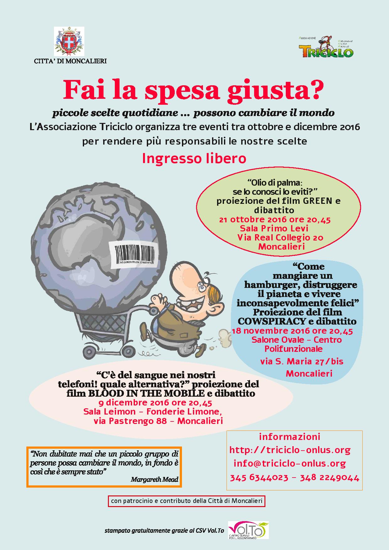 Progetto “Fai la spesa giusta? piccole scelte quotidiane… possono cambiare il mondo” Nei mesi di ottobre, novembre e dicembre 2016, a Moncalieri, Triciclo propone tre iniziative in orario serale, con il fine di diffondere la conoscenza e quindi la pratica di stili di vita che contribuiscano a ridurre l’impronta ecologica di ognuno di noi e che, conseguentemente, concorrano a diminuire il disequilibrio tra Nord e Sud del Mondo.