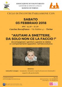 « Tutti gli Eventi Questo evento è passato. Genitori si diventa – Incontro “Aiutami a smettere, da solo non ce la faccio!” 3 Febbraio 2018 h 14:30 - 17:30 « Gita al Castello di Guarene con l’Associazione Vivant Giochi di società con l’Associazione Di.A.Psi. Torino » “Aiutami a smettere, da solo non ce la faccio! – Accompagnare i genitori a gestire la rabbia e i comportamenti oppositivi nell’età evolutiva” è il titolo dell’incontro organizzato dall’Associazione “Genitori si Diventa” dalla sezione di Torino, all’interno del ciclo di appuntamenti “Parliamone Con”. Appuntamento sabato 3 febbraio dalle 14.30 alle 17.30 a Cascina Roccafranca, in via Rubino 45 a Torino. Relatrice Antonella Castagno, insegnante e formatrice esperta di processi relazionali e supporto alla genitorialità. L’incontro è libero, aperto a tutti e gratuito (non è previsto servizio di assistenza ai bambini). È gradita l’iscrizione, con una mail all’indirizzo diventareto@genitorisidiventa.org, oppure compilando il form on line sul sito www.genitorisiventa.org. Per informazioni Sabrina De Fazio tel. 328/8869047 Linda Regina tel. 349/6947478 + Google Calendar+ Esporta in iCal Dettagli Data: 3 Febbraio 2018 Ora: 14:30 - 17:30 Organizzatore Genitori Si Diventa Sito web: www.genitorisidiventa.org Luogo Cascina Roccafranca Via Rubino, 45 Torino, Italia + Google Maps