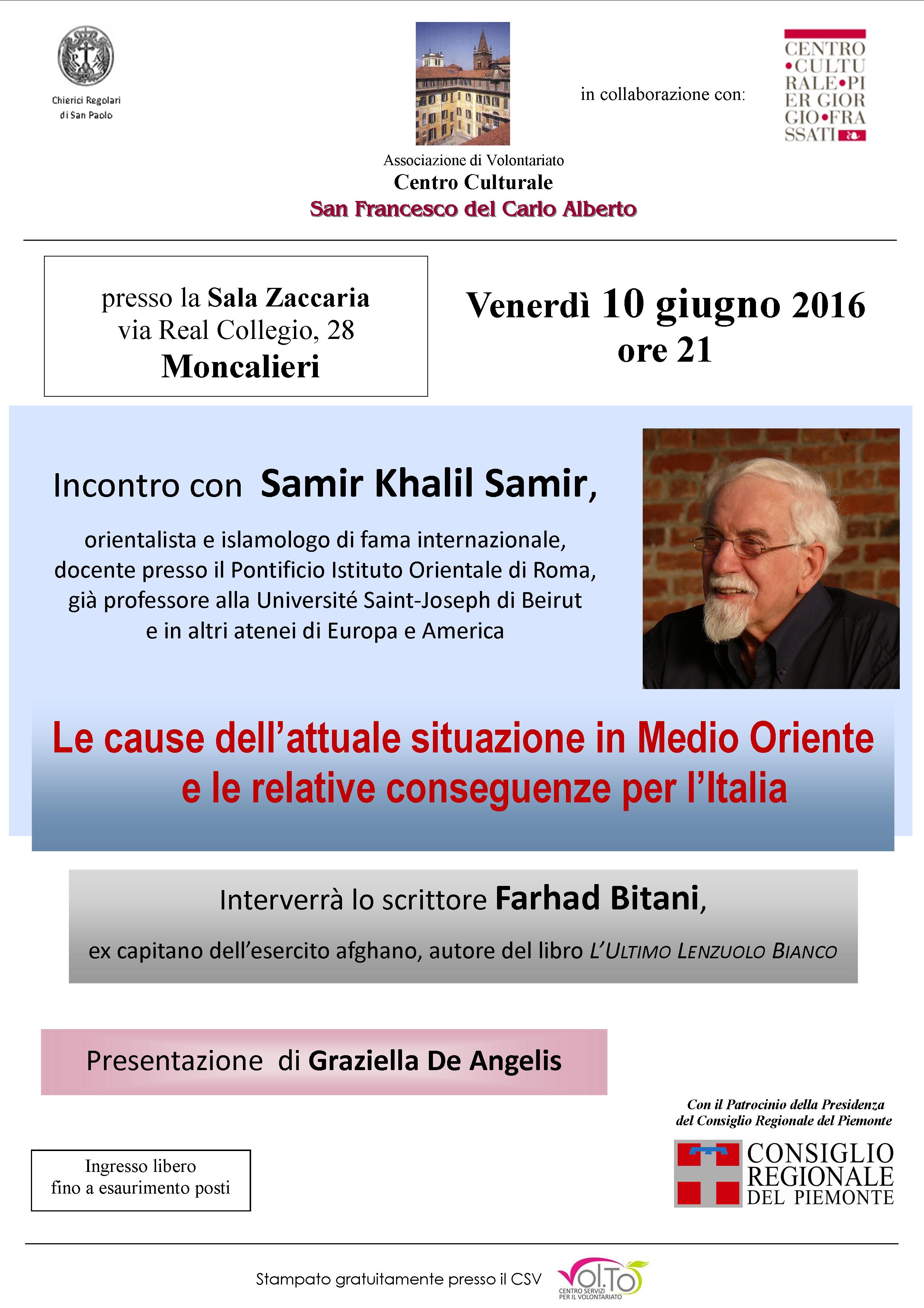 2016LocSamirVenerdì 10 giugno, alle ore 21, presso la Sala Zaccaria in via Real Collegio 28 a Moncalieri, il Centro Culturale San Francesco del Carlo Alberto presenta l’incontro con Samir Khalil Samir a tema “Le cause dell’attuale situazione in Medio Oriente e le relative conseguenze per l’Italia”.