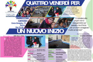 « Tutti gli Eventi Questo evento è passato. Quattro venerdì per un nuovo inizio al Cafasso: Identità e Dialogo. 12 Maggio 2017 h 21:00 - 22:30 « “Riconoscimento e conflitto: interpretazione antropologica e mediazione” nell’ambito del corso di formazione dell’Associazione Psicologi nel Mondo “Migrando” FORmaggio in oratorio: una degustazione di formaggi italiani e birra artigianale con il Maggio in Oratorio » A Maggio festeggiamo insieme i 70 anni della Parrocchia San Giuseppe Cafasso. In occasione dei 70 anni della Parrocchia San Giuseppe Cafasso si organizzano una serie di appuntamenti culturali per il mese di Maggio dal titolo “Quattro venerdì per un nuovo inizio”. L’intento è di festeggiare insieme i 70 anni della Chiesa Piccola, i 60 anni dell’apertura della Scuola Cafasso e 50 anni dall’arrivo delle Suore di Carità dell’Assunzione. “Identità e dialogo” è il titolo dell’incontro del 12 maggio con Jawad Alamat, Responsabile delle scuole cristiane della Prelatura di Tunisi. Daranno una testimonianza anche i responsabili della Scuola Cafasso che da anni “operano sul territorio, per il territorio”. La mostra a tema è “Borgo Mondo” realizzata dal gruppo Photograffiatori di Borgo Vittoria (esposta dal 12 al 19 maggio nella Chiesa Piccola). Tutti gli incontri si svolgeranno alle 21 in corso Grosseto, 72. Gli orari per le prenotazioni delle mostre sono: da lunedì a venerdì: 12.00 – 14.00 e 17.30 – 19.30 (prenotazioni per i gruppi). Sabato e domenica: 10.00 – 12.00 (prenotazione per i gruppi) e 14.00 – 18.00 (prenotazione per i gruppi). Per prenotazioni e informazioni: 3355208579. Dal 15/05/2017 dalle 10.00 alle 12.30, dal lunedì al sabato. + Google Calendar+ Esporta in iCal Dettagli Data: 12 Maggio 2017 Ora: 21:00 - 22:30 Categorie Evento: Calendario, Eventi in primo piano