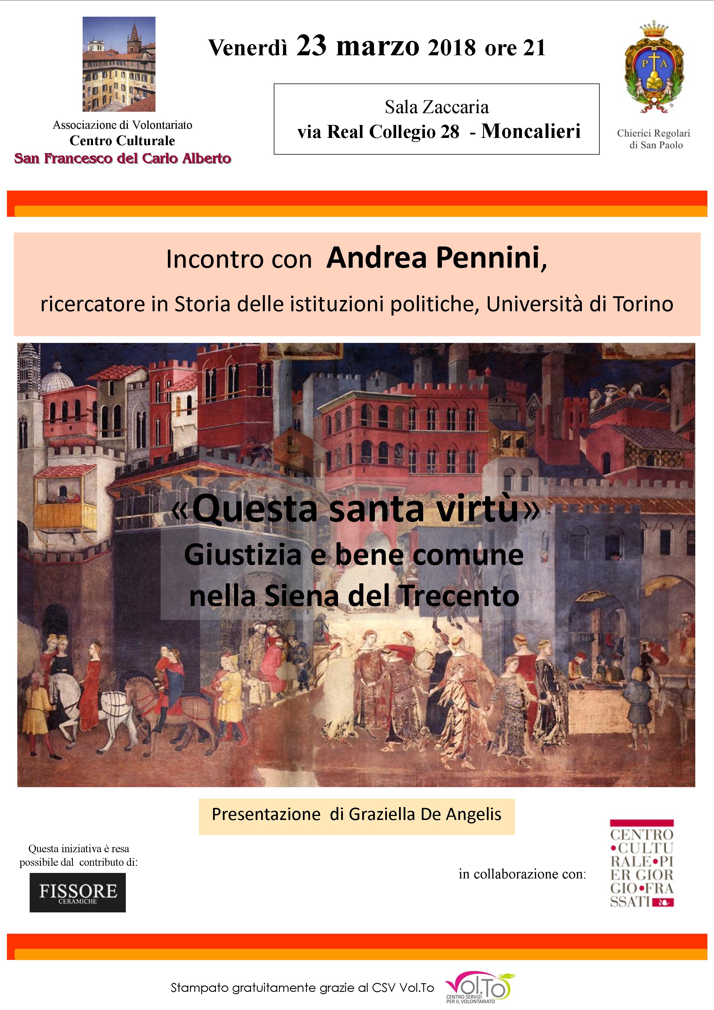 L’Associazione San Francesco del Carlo Alberto, in collaborazione con i Chierici Regolari di San Paolo e il Centro Culturale Pier Giorgio Frassati, organizza un incontro con Andrea Pennini, Ricercatore in Storia delle istituzioni politiche dell’Università di Torino, dal titolo “Questa santa virtù. Giustizia e bene comune nella Siena del Trecento.