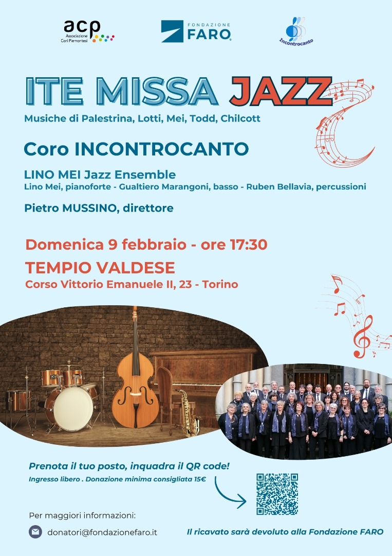 Fondazione FARO: un concerto per coro e trio jazz per sostenere le cure News 28 Gennaio 202510 Febbraio 2025 La Fondazione FARO organizza domenica 9 febbraio 2025 alle 17.30 presso il Tempio Valdese di Torino in corso Vittorio Emanuele 23, il cui ricavato sarà devoluto a sostegno delle attività e dei progetti della Fondazione. Il concerto ITE MISSA JAZZ accosterà due linguaggi apparentemente lontani, la moderna armonia del jazz e il coro più classico, un affascinante viaggio musicale che coniuga voci e musica in modo coinvolgente accompagnando il pubblico verso culture e atmosfere differenti. Il coro dell’associazione Incontrocanto APS è stato fondato nel 1993. Il suo repertorio spazia su diversi generi e periodi storici con una particolare attenzione a quello europeo sacro e profano dell’800 e 900. Nella sua trentennale storia ha organizzato diverse produzioni significative partecipando a manifestazioni musicali come MITO Settembre Musica. Lino Mei Jazz Ensemble nasce dalla convergenza musicale di tre professionisti della scena torinese la cui formazione classica del Conservatorio ha permesso loro di spaziare nel repertorio moderno, contemporaneo e jazzistico attraverso concerti, tournée e produzioni discografiche. La Fondazione FARO ETS è un’organizzazione senza scopo di lucro che da più di 40 anni si occupa di assistere dal punto vista sanitario, fisico, emotivo e psicologico coloro che necessitano di cure palliative, prendendosi cura anche delle loro famiglie. Le cure palliative si occupano di garantire la migliore qualità di vita possibile, alleviando i sintomi fisici e sostenendo il paziente e i suoi cari sia a casa sia negli hospice, grazie al lavoro di un’equipe specializzata composta da professionisti in vari ambiti scientifici e dall’instancabile supporto dei numerosi volontari che donano il proprio tempo in favore dei progetti della Fondazione. Ad oggi la FARO opera sui territori di Torino, Lanzo, Carignano, Chivasso e Leinì. Ingresso libero con donazione minima consigliata di €15,00 prenotabile online al link https://www.eventbrite.com/e/concerto-ite-missa-jazz-tickets-1119669314059?aff=oddtdtcreator o inquadrando il QRcode sulla locandina dell’evento oppure direttamente in loco prima del concerto. Per informazioni: donatori@fondazionefaro.it Share on Facebook Share Share on TwitterTweet Send email Mail Print Print