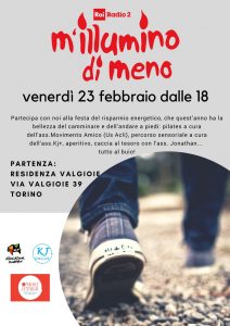 ← Torna agli Eventi Residenza Valgioie + Google Maps via Valgioie 39 Torino, 10100 Italia 0117770861 http://caterpillar.blog.rai.it/milluminodimeno/ Febbraio 2018 M’illumino di meno al Tonolli 23 Febbraio 2018 h 18:00 - 23:00 Residenza Valgioie, via Valgioie 39 Torino, 10100 Italia + Google Maps L'Associazione Jonathan ha aderito alla giornata del risparmio energetico "M'illumino di meno" promossa da Rai Radio 2 prevista per venerdì 23 febbraio 2018 organizzando alcune attività sul territorio della Circoscrizione 4. Il programma prevede: ore 18,00 Pilates al buio gestito dall'Associazione Movimento Amico - presso la Residenza Valgioie (Via Valgioie 39 - Torino); ore 18,30 Percorso sensoriale gestito dall'Associazione KJ+ - presso la Residenza Valgioie (Via Valgioie 39 - Torino); ore 19,00 - aperitivo, ciascun partecipante è pregato di portare generi alimentari confezionati da condividere con… Ulteriori informazioni » + Esporta eventi
