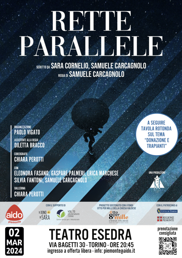 “Rette Parallele”: teatro e solidarietà a Torino per la donazione degli organi News 26 Febbraio 202427 Febbraio 2024 Sabato 2 marzo 2024, a Torino, presso il Teatro Esedra in Via Bagetti 30 a Torino, si terrà una serata speciale che unisce teatro, sensibilizzazione e solidarietà. Lo spettacolo “Rette Parallele”, organizzato da AIDO Piemonte in collaborazione con l’Associazione “Il dono di Sara”, promette di essere un evento emozionante e ricco di significato, dedicato alla sensibilizzazione sulla fibrosi cistica e sull’importanza della donazione di organi. Rette Parallele, lo spettacolo “Rette Parallele” nasce da un’idea di Sara Cornelio, giovane donna la cui vita è stata segnata dalla fibrosi cistica, malattia che l’ha portata via prematuramente nel 2022. La rappresentazione, frutto della collaborazione tra il regista Samuele Carcagnolo e il produttore Paolo Vigato, vuole trasmettere un messaggio potente: la condivisione del respiro come atto rivoluzionario contro l’indifferenza e la comprensione del vero valore della vita. La fibrosi cistica, una delle malattie genetiche gravi più diffuse in Italia, colpisce diversi organi vitali, principalmente l’apparato respiratorio e quello digerente. In molti casi, l’unica speranza di sopravvivenza è rappresentata dal trapianto di organi. Attraverso “Rette Parallele”, AIDO Piemonte e “Il dono di Sara” vogliono non solo onorare la memoria di Sara Cornelio, ma anche promuovere una maggiore consapevolezza sulla donazione di organi, tessuti e cellule. Sara Cornelio, inno alla bellezza e all’amore La vita di Sara Cornelio è stata un inno alla bellezza e all’amore, nonostante le difficoltà imposte dalla malattia. La sua storia e il suo impegno hanno lasciato un segno indelebile nella comunità, trasformando la paura e la sofferenza in messaggi di gioia e speranza. “Rette Parallele” vuole essere un omaggio alla sua vita, alle persone che l’hanno conosciuta e a tutte quelle che continueranno a scoprire il suo lascito attraverso le sue opere e scritti. Al termine dello spettacolo, è previsto un talk che vedrà la partecipazione dei rappresentanti delle due associazioni e del dott. Raffaele Potenza, medico del Coordinamento Regionale delle Donazioni e Prelievi Piemonte e Valle D’Aosta. Questo momento di dialogo offrirà al pubblico la possibilità di ascoltare le testimonianze di chi ha ricevuto un trapianto, creando un ponte diretto tra la scena teatrale e la realtà della donazione e del trapianto di organi. La serata non ha solo un valore culturale e di sensibilizzazione, ma anche un obiettivo benefico. Le offerte raccolte durante l’evento saranno destinate a finanziare progetti di informazione e sensibilizzazione sulla donazione degli organi nel territorio piemontese. La realizzazione di “Rette Parallele” è stata possibile grazie al sostegno dei fondi otto per mille della Chiesa Valdese e gode del patrocinio della Città di Torino, della Regione Piemonte, oltre al supporto di Vol.To Centro servizi per il volontariato di Torino. Per partecipare a questo evento unico e contribuire a una causa importante, è possibile comunicare la propria presenza e riservare il posto tramite il QR-code presente sulla locandina o cliccando qui. Un’occasione imperdibile per riflettere sull’importanza del dono della vita e sulla solidarietà che può fare la differenza nel percorso di chi lotta ogni giorno contro la fibrosi cistica. LEGGI ANCHE: Rivoluzione Dell’accessibilità A Torino: Un Progetto Innovativo Per Una Città Senza Barriere Share on Facebook Share Share on TwitterTweet Send email Mail Print Print